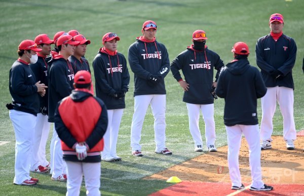 KIA 타이거즈가 13일 전남 함평 기아챌린저스필드에서 2022 스프링캠프를 가졌다. 김태진, 나성범, 김선빈, 이우성이 훈련 지시를 듣고 있다.