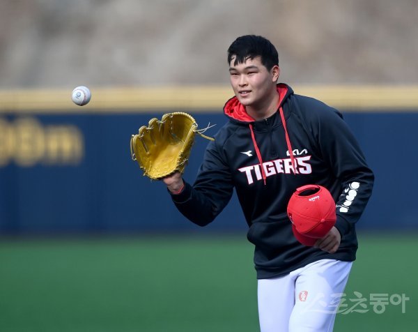 KIA 타이거즈가 13일 전남 함평 기아챌린저스필드에서 2022 스프링캠프를 가졌다. 최지민이 볼을 받고 있다.