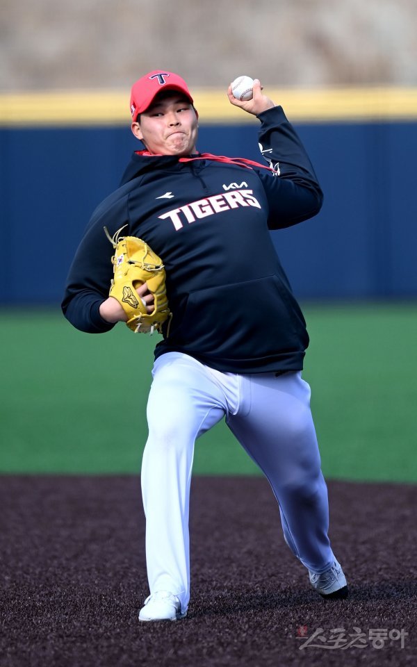 KIA 타이거즈가 13일 전남 함평 기아챌린저스필드에서 2022 스프링캠프를 가졌다. 최지민이 힘차게 볼을 던지고 있다.