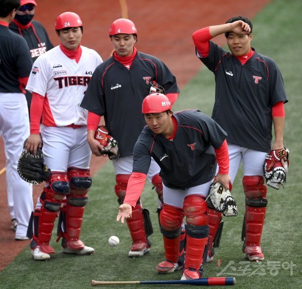 KIA 타이거즈가 13일 전남 함평 기아챌린저스필드에서 2022 스프링캠프를 가졌다. 김민식, 한승택, 신범수, 김선우가 훈련 전 게임을 하고 있다.