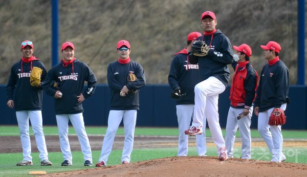 KIA 타이거즈가 13일 전남 함평 기아챌린저스필드에서 2022 스프링캠프를 가졌다. 투수조가 수비 훈련을 하고 있다.