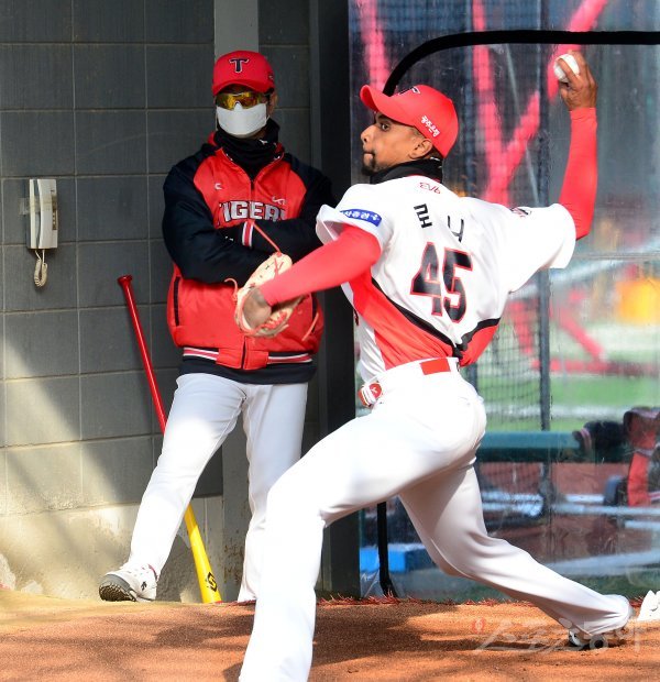 KIA 타이거즈가 13일 전남 함평 기아챌린저스필드에서 2022 스프링캠프를 가졌다. 김종국 감독이 로니의 투구를 바라보고 있다.
