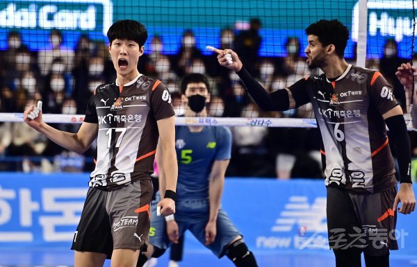 13일 천안 유관순체육관에서 열린 ‘2021~2022 도드람 V-리그’ 남자부 천안 현대캐피탈과 안산 OK 금융그룹의 경기에서 현대캐피탈에 세트스코어 3-0으로 승리한 OK금융그룹 박창성이 득점에 성공한 후 기뻐하고 있다.