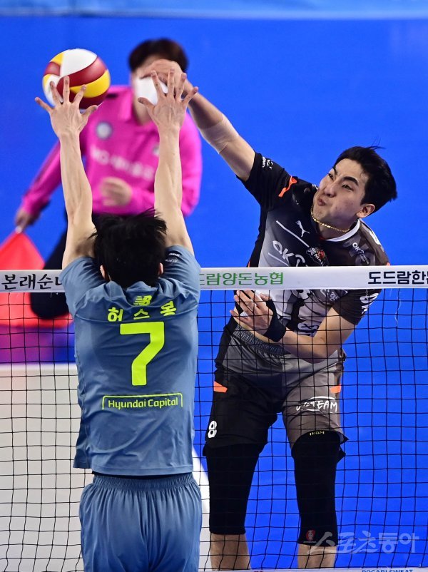 13일 천안 유관순체육관에서 열린 ‘2021~2022 도드람 V-리그’ 남자부 천안 현대캐피탈과 안산 OK 금융그룹의 경기에서 OK금융그룹 차지환이 현대캐피탈 블로커 앞에서 스파이크를 하고 있다.