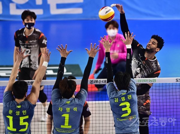 13일 천안 유관순체육관에서 열린 ‘2021~2022 도드람 V-리그’ 남자부 천안 현대캐피탈과 안산 OK 금융그룹의 경기에서 OK금융그룹 레오가 현대캐피탈 블로커 앞에서 스파이크를 하고 있다.