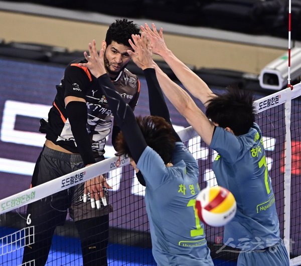 13일 천안 유관순체육관에서 열린 ‘2021~2022 도드람 V-리그’ 남자부 천안 현대캐피탈과 안산 OK 금융그룹의 경기에서 OK금융그룹 레오가 현대캐피탈 블로커 앞에서 스파이크를 하고 있다.