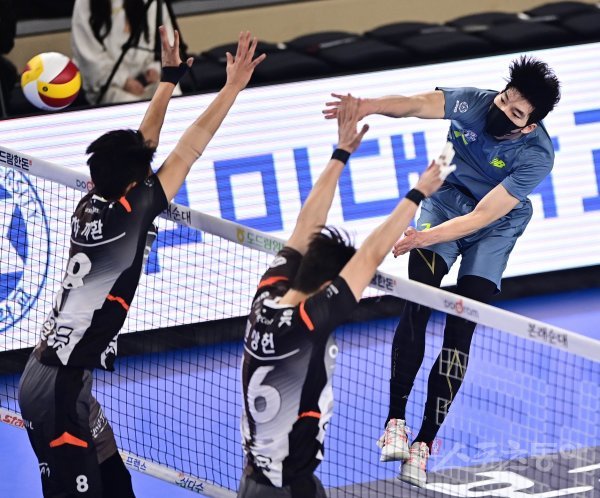 13일 천안 유관순체육관에서 열린 ‘2021~2022 도드람 V-리그’ 남자부 천안 현대캐피탈과 안산 OK 금융그룹의 경기에서 현대캐피탈 허수봉이 OK금융그룹 블로커 앞에서 스파이크를 하고 있다.