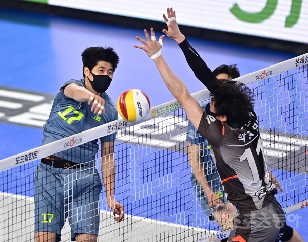 13일 천안 유관순체육관에서 열린 ‘2021~2022 도드람 V-리그’ 남자부 천안 현대캐피탈과 안산 OK 금융그룹의 경기에서 현대캐피탈 박상하가 OK금융그룹 블로커 앞에서 스파이크를 하고 있다.