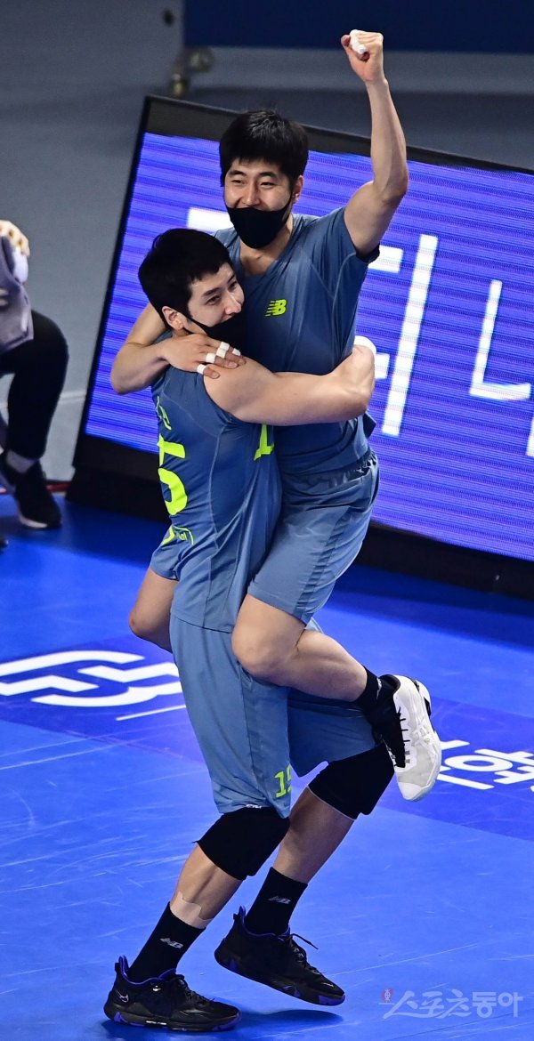 13일 천안 유관순체육관에서 열린 ‘2021~2022 도드람 V-리그’ 남자부 천안 현대캐피탈과 안산 OK 금융그룹의 경기에서 현대캐피탈 문성민과 박상하가 득점에 성공한 후 기쁨을 나누고 있다.