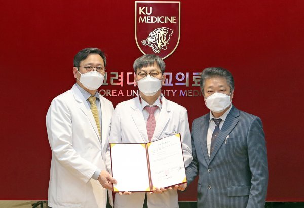 고려대학교 산학협력단과투비디티엑스가 기술이전협약식에서 기념사진을 촬영하고 있다. 함병주 고려대 의료원산학협력단장, 김병조 고려대 의대 교수, 김동윤 투비디티엑스 대표이사(왼쪽부터) 사진|고려대의료원