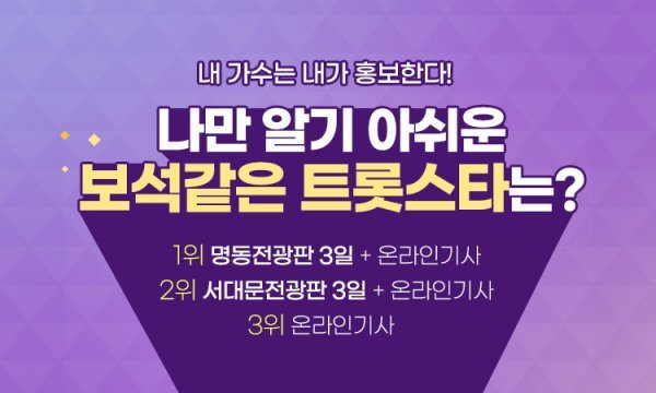 14일 트롯 문화를 사랑하는 사람들을 응원하는 서비스 트롯픽(trotpick)에서는 현재 ‘내 가수는 내가 홍보한다! 나만 알기 아쉬운 보석같은 트롯스타는?’이라는 주제의 투표가 진행되고 있다. 투표는 14일부터 27일 10시까지 2주간 열려 있다. 순위가 엎치락뒤치락 하는 가운데 안성훈, 김수찬, 양지원, 신성, 장보윤 등의 치열한 접전이 이어지고 있다.