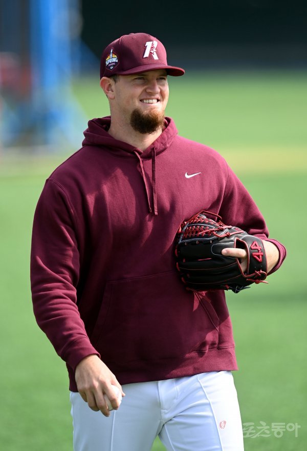 키움 히어로즈가 14일 전남 고흥 거금야구장에서 2022 스프링캠프를 가졌다. 애플러가 웃으며 그라운드로 나오고 있다.