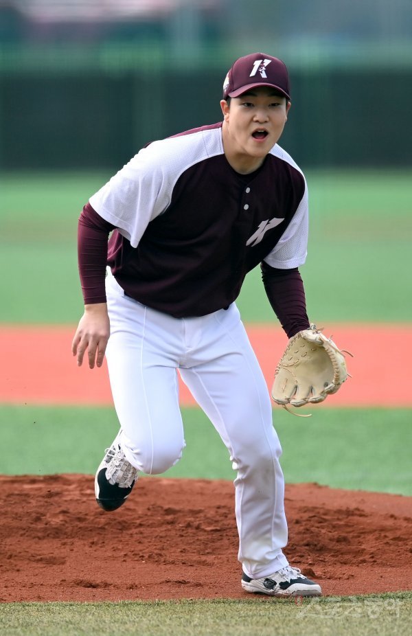 키움 히어로즈가 14일 전남 고흥 거금야구장에서 2022 스프링캠프를 가졌다. 박주성이 수비 훈련을 하고 있다.