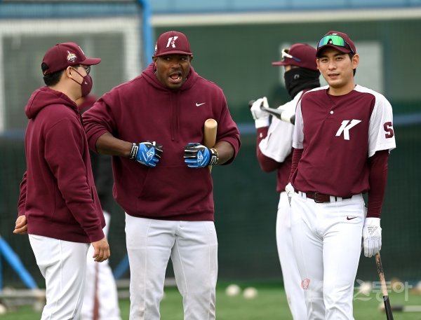 키움 히어로즈가 14일 전남 고흥 거금야구장에서 2022 스프링캠프를 가졌다. 푸이그와 이정후가 이야기를 나누고 있다.