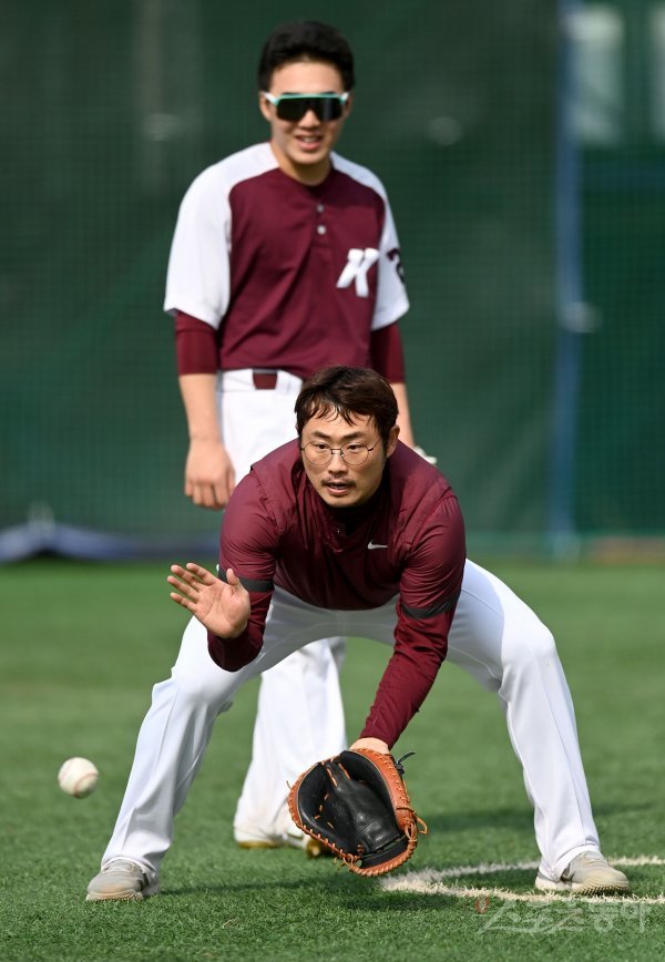 키움 히어로즈가 14일 전남 고흥 거금야구장에서 2022 스프링캠프를 가졌다. 이지영이 수비 훈련을 하고 있다.