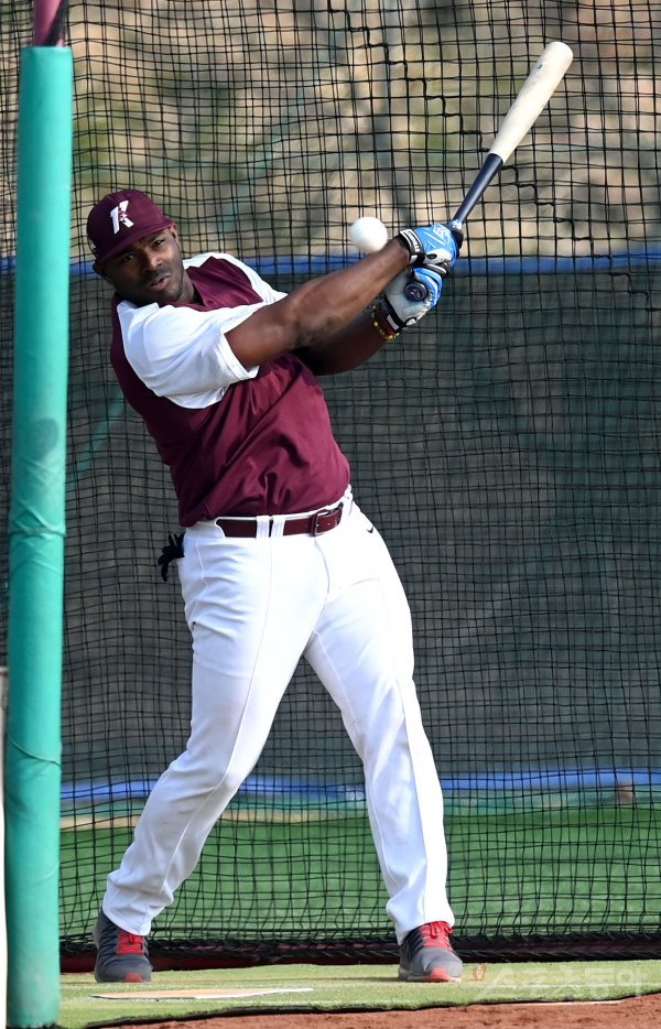 키움 히어로즈가 14일 전남 고흥 거금야구장에서 2022 스프링캠프를 가졌다. 푸이그가 타격 훈련을 하고 있다.