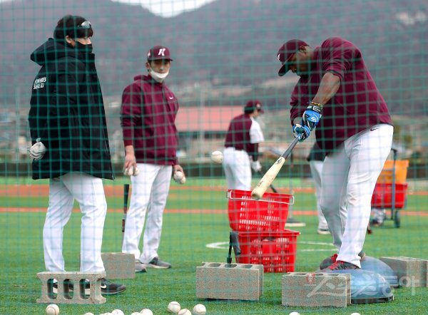 키움 히어로즈가 14일 전남 고흥 거금야구장에서 2022 스프링캠프를 가졌다. 푸이그가 밸런스볼 위에서 배팅을 하고 있다.