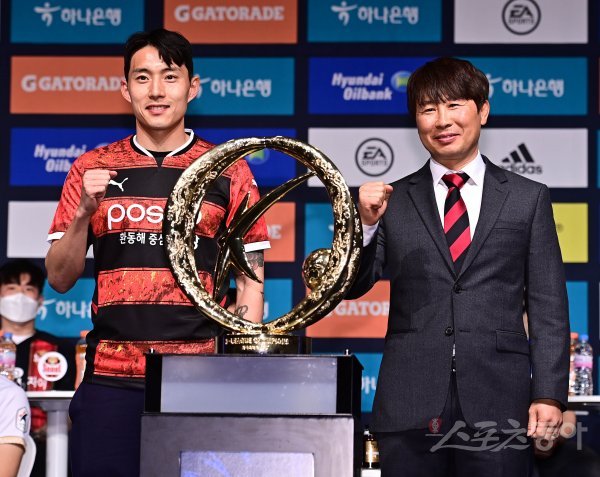 14일 서울 용산구 백범김구기념관에서 열린 ‘하나원큐 K리그 2022 개막 미디어데이’에서 포항 신진호와 김기동 감독이 포즈를 취하고 있다.