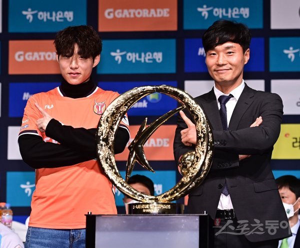 14일 서울 용산구 백범김구기념관에서 열린 ‘하나원큐 K리그 2022 개막 미디어데이’에서 제주 유나이티드 안현범과 남기일 감독이 포즈를 취하고 있다.