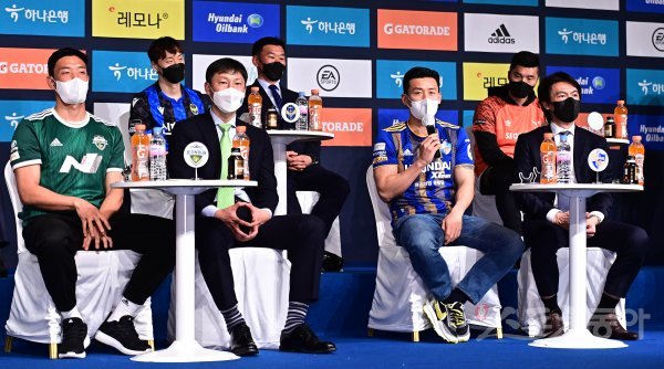14일 서울 용산구 백범김구기념관에서 열린 ‘하나원큐 K리그 2022 개막 미디어데이’에서 울산 김태환이 질문에 답하고 있다.