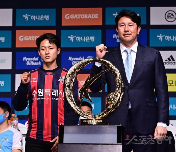 14일 서울 용산구 백범김구기념관에서 열린 ‘하나원큐 K리그 2022 개막 미디어데이’에서 수원FC 이승우, 김도균 감독이 포즈를 취하고 있다.