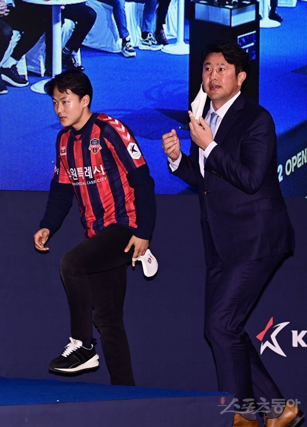 14일 서울 용산구 백범김구기념관에서 열린 ‘하나원큐 K리그 2022 개막 미디어데이’에서 수원FC 이승우와 김도균 감독이 무대에 오르고 있다.