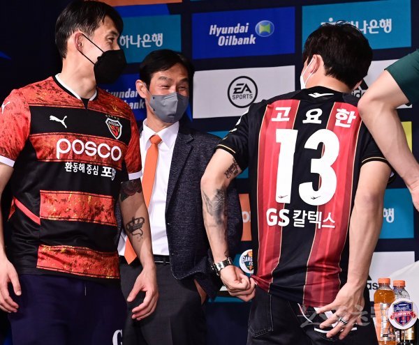 14일 서울 용산구 백범김구기념관에서 열린 ‘하나원큐 K리그 2022 개막 미디어데이’에서 강원FC 최용수 감독이 고요한과 인사하고 있다.