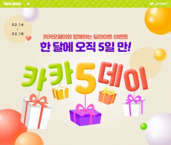 진에어는 14일부터 18일까지 카카오페이 이용고객을 대상으로 국내선 할인 혜택을 제공하는 ‘카카5데이’ 프로모션을 실시한다.14일~3월31일 운항하는 국내선 항공편 적용