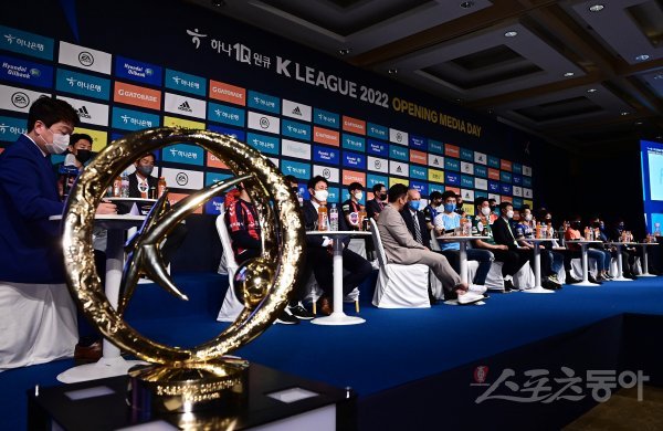 14일 서울 용산구 백범김구기념관에서 열린 ‘하나원큐 K리그 2022 개막 미디어데이’에서 12개 구단 감독과 대표 선수가 질문에 답하고 있다. 용산 | 주현희 기자 teth1147@donga.com