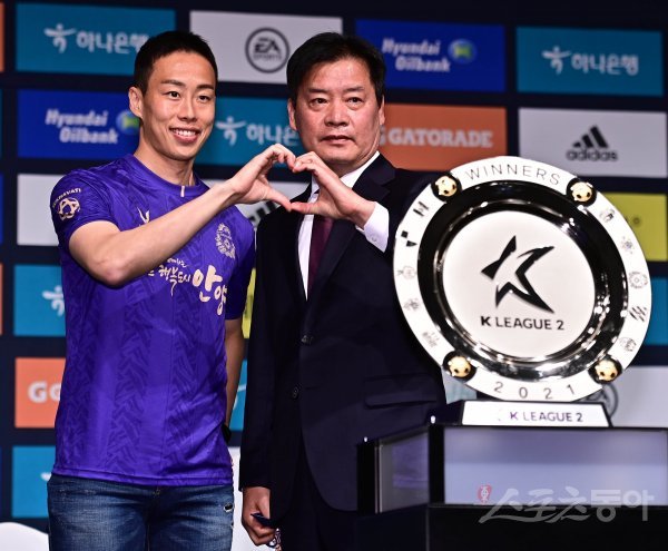 15일 서울 용산구 백범김구기념관에서 열린 ‘하나원큐 K리그2 2022 개막 미디어데이’에서 FC안양 김경중과 이우형 감독이 포즈를 취하고 있다.