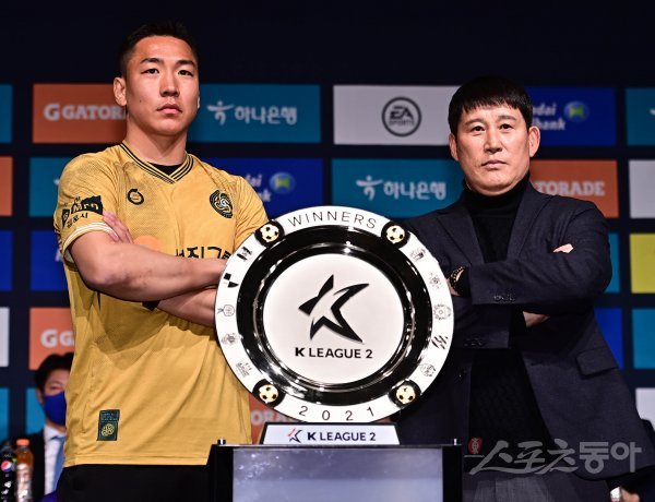 15일 서울 용산구 백범김구기념관에서 열린 ‘하나원큐 K리그2 2022 개막 미디어데이’에서 김포FC 이상욱과 고정운 감독이 포즈를 취하고 있다.