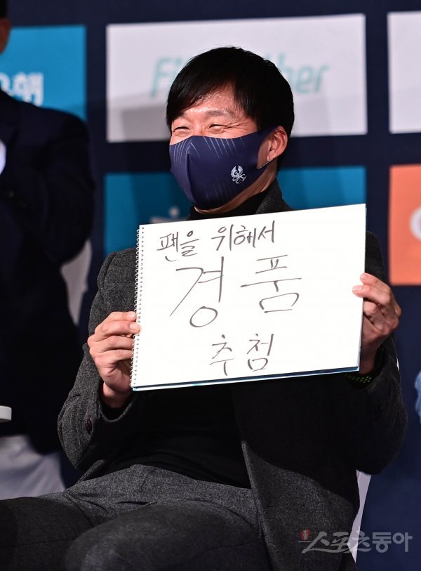 15일 서울 용산구 백범김구기념관에서 열린 ‘하나원큐 K리그2 2022 개막 미디어데이’에서 광주FC 이정효 감독이 승격 공약을 스케치북에 적어 공개하고 있다.