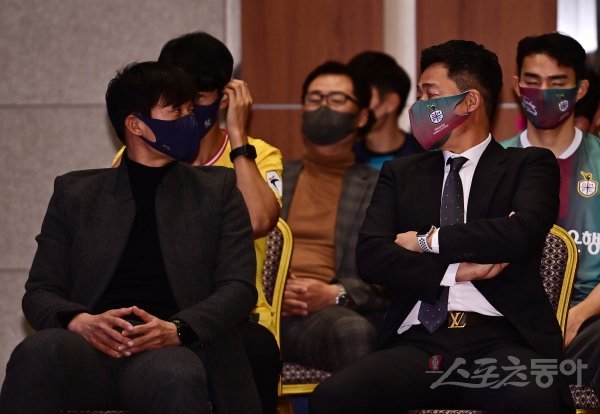 15일 서울 용산구 백범김구기념관에서 열린 ‘하나원큐 K리그2 2022 개막 미디어데이’에 앞서 광주FC 이정효 감독과 대전 이민성 감독이 이야기를 하고 있다.