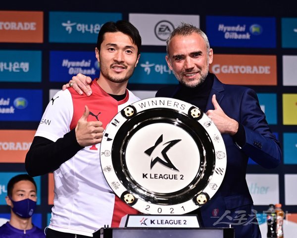 15일 서울 용산구 백범김구기념관에서 열린 ‘하나원큐 K리그2 2022 개막 미디어데이’에서 부산 박종우와 페레즈 감독이 포즈를 취하고 있다.
