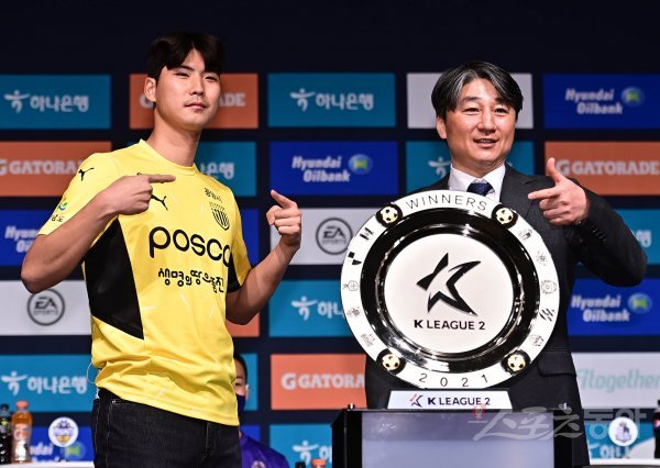 15일 서울 용산구 백범김구기념관에서 열린 ‘하나원큐 K리그2 2022 개막 미디어데이’에서 전남 박인혁과 전경준 감독이 포즈를 취하고 있다.