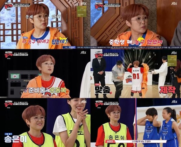환영식 겸 몸풀기에 돌입한 송은이는 개성 넘치는 ‘농구 패션’으로 시선을 단번에 사로잡았다. 그는 “스태프들이 저한테 거는 기대가 큰 거 같다”라며 소속사 직원들이 특별 제작한 송대표 농구복을 자랑, 남다른 맞춤 제작 의상으로 ‘농구 어린이’의 당찬 각오를 어필했다.