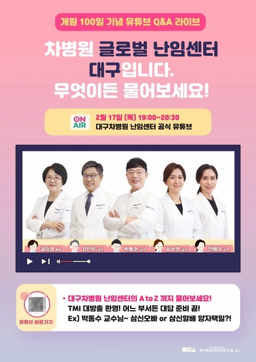 차 의과학대학교 대구차병원 난임센터는 개월 100일을 맞아 17일 오후 7시 유튜브 라이브 ‘차병원 글로벌 난임센터 대구입니다. 무엇이든 물어보세요’를 진행한다.SNS 사전질문 통해 정보 제공, 댓글 참가자 기념품도
