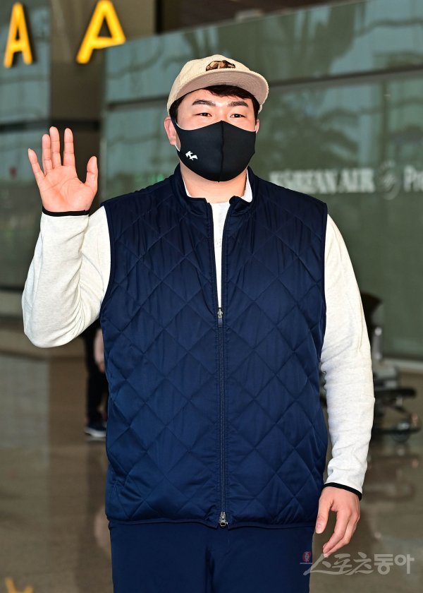 템파베이 최지만이 18일 인천국제공항 2터미널에서 포즈를 취하고 있다. 최지만은 미국으로 건너가 개인 훈련을 할 예정이었으나 PCR검사 관련 서류 문제로 내일(19일) 출국한다.