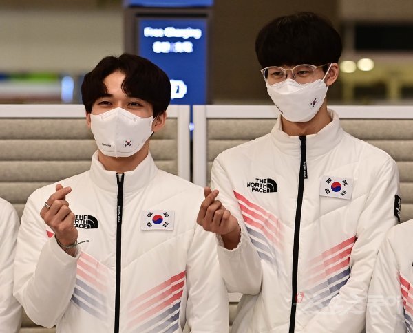 ‘2022 제24회 베이징동계올림픽대회’를 마친 쇼트트랙 대표팀 김동욱과 이준서가 18일 인천국제공항 2터미널을 통해 귀국한 뒤 포즈를 취하고 있다.
