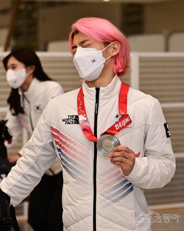 ‘2022 제24회 베이징동계올림픽대회’를 마친 쇼트트랙 대표팀 곽윤기가 18일 인천국제공항 2터미널을 통해 귀국한 뒤 포즈를 취하고 있다.