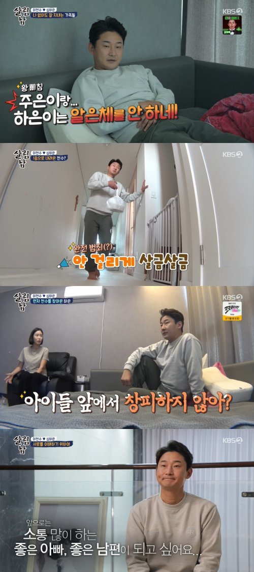 이천수는 19일 방송된 KBS 2TV 예능 프로그램 \'살림하는 남자들\' 시즌 2(이하 \'살림남\')에서 딸 이주은의 행동에 삐쳐서 3일 동안 방 안에서 혼자 지내는 귀여운 면모를 자랑했다.