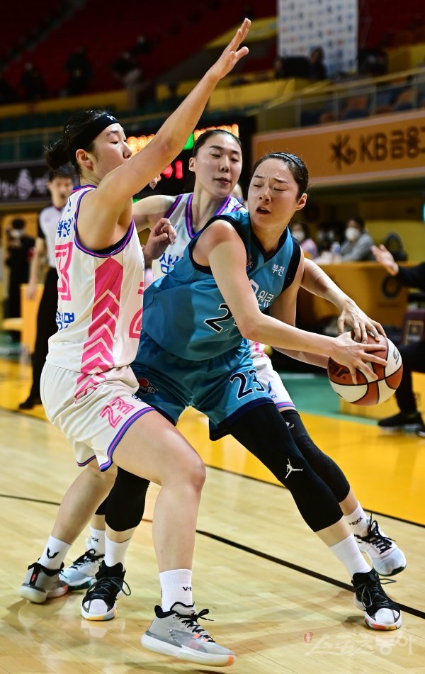 20일 충북 청주체육관에서 열린 ‘삼성생명 2021-2022 여자프로농구 퓨처스리그’ 용인 삼성생명과 부천 하나원큐의 경기에서 하나원큐 이하은이 삼성생명 박찬양의 수비에 동료를 찾고 있다.