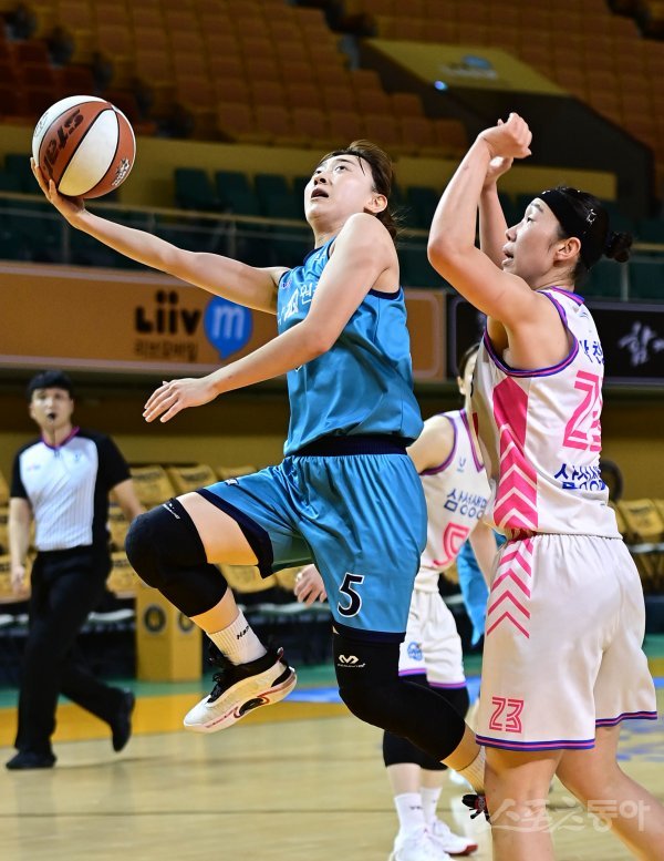 20일 충북 청주체육관에서 열린 ‘삼성생명 2021-2022 여자프로농구 퓨처스리그’ 용인 삼성생명과 부천 하나원큐의 경기에서 하나원큐 이채은이 삼성생명 수비를 뚫고 슛을 하고 있다.