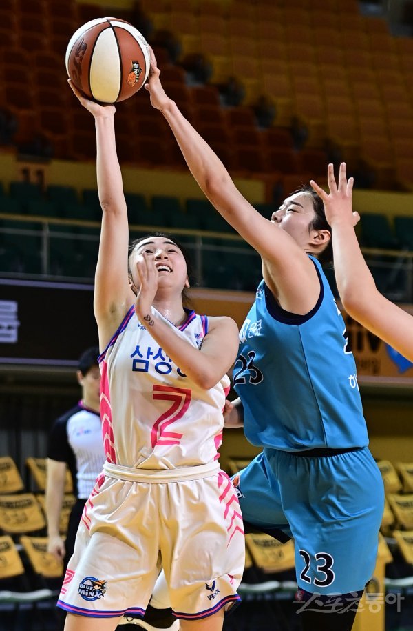 20일 충북 청주체육관에서 열린 ‘삼성생명 2021-2022 여자프로농구 퓨처스리그’ 용인 삼성생명과 부천 하나원큐의 경기에서 삼성생명 최서연이 하나원큐 이하은에게 블록슛을 당하고 있다.