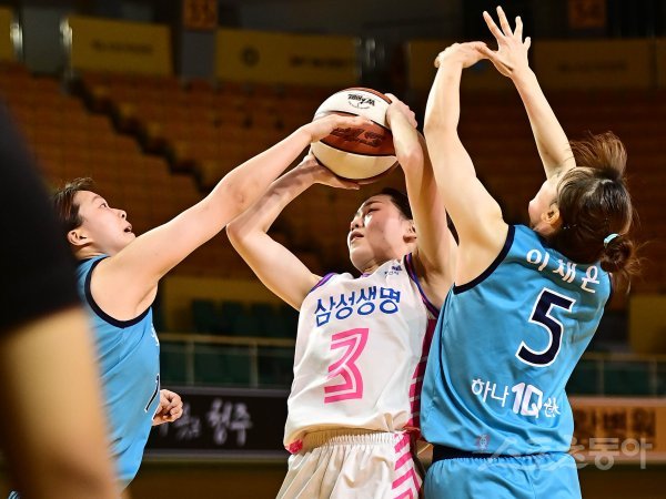 20일 충북 청주체육관에서 열린 ‘삼성생명 2021-2022 여자프로농구 퓨처스리그’ 용인 삼성생명과 부천 하나원큐의 경기에서 삼성생명 조수아가 하나원큐 수비 사이에서 슛을 하고 있다.