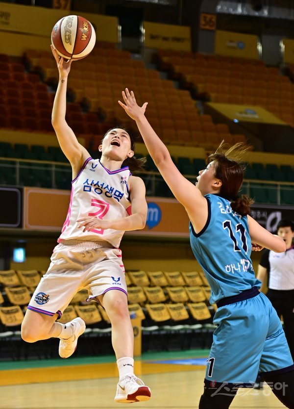 20일 충북 청주체육관에서 열린 ‘삼성생명 2021-2022 여자프로농구 퓨처스리그’ 용인 삼성생명과 부천 하나원큐의 경기에서 삼성생명 조수아가 하나원큐 수비를 뚫고 슛을 하고 있다.