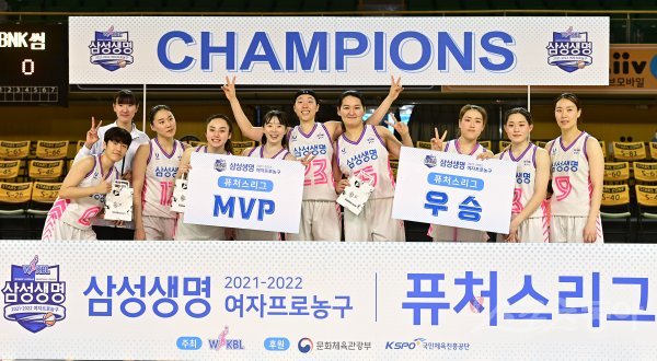 20일 충북 청주체육관에서 열린 ‘삼성생명 2021-2022 여자프로농구 퓨처스리그’에서 3전 전승으로 우승을 차지한 삼성생명 선수들이 기념 촬영을 하고 있다.