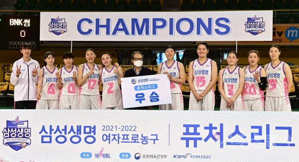 20일 충북 청주체육관에서 열린 ‘삼성생명 2021-2022 여자프로농구 퓨처스리그’에서 3전 전승으로 우승을 차지한 삼성생명 선수들이 이병완 WKBL 총재와 기념 촬영을 하고 있다.