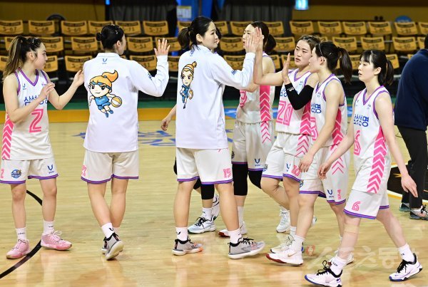 20일 충북 청주체육관에서 열린 ‘삼성생명 2021-2022 여자프로농구 퓨처스리그’ 용인 삼성생명과 부천 하나원큐의 경기에서 하나원큐에 68-62로 승리를 거둔 삼성생명 선수들이 기쁨을 나누고 있다.