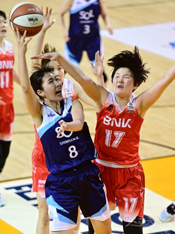 20일 충북 청주체육관에서 열린 ‘삼성생명 2021-2022 여자프로농구 퓨처스리그’ 인천 신한은행과 부산 BNK 썸의 경기에서 신한은행 최지선이 BNK 썸 최민주의 앞에서 슛을 하고 있다.